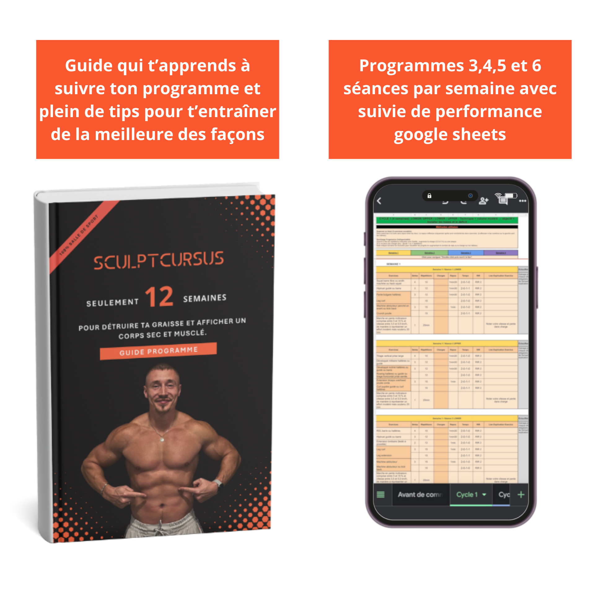 - ✓ Programmes Google Sheets 3,4,5 et 6 séances par semaine avec suivi de performance